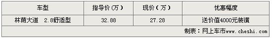 據(jù)林蔭大道銷售人員表示,購買林蔭大道 2.8舒適型除了可以得到最高5.6萬元的價(jià)格優(yōu)惠外,商家還在每輛車銷售的同時還搭配汽車裝潢贈品。商家現(xiàn)在展廳有黑色和炭晶兩款現(xiàn)車。更多詳情隨時聯(lián)系經(jīng)銷商。
