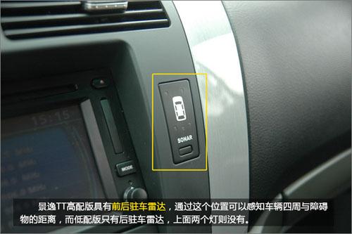 作為一款“高性價”比轎車,景逸的配置看起來有些眼花繚亂,甚至出乎意料:四向可調節方向盤、左腳休息踏板、泊車輔助系統、倒車影像系統、可外接音源(AUX/USB/iPod等)、CD支持MP3/WMA、6喇叭環繞揚聲器系統、自動頭燈、空調后排出風口等這一切都體現出景逸TT超高的性價比。