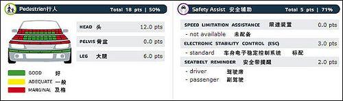 上圖描述的是車輛對(duì)于路人的保護(hù)情況和安全輔助設(shè)備配置情況。路人安全在歐洲已經(jīng)普遍重視,很多檢測(cè)項(xiàng)目已經(jīng)有了很清晰的標(biāo)準(zhǔn)。圖中看出,高爾夫6代翼子板部分對(duì)行人傷害是比較重的。在安全配置方面,高爾夫6代標(biāo)配了ESC,也就是我們國(guó)內(nèi)常說(shuō)的ESP,不知道國(guó)產(chǎn)版本會(huì)不會(huì)“偷工減料”。駕駛席和副駕駛的安全帶提醒裝置都為高爾夫6代的最終成績(jī)做了加分。