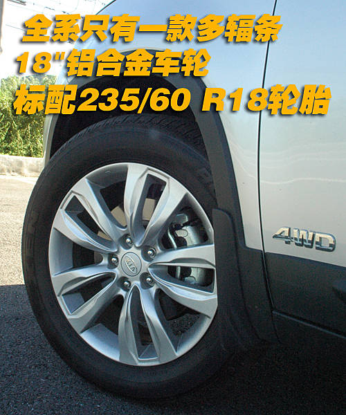 全新索蘭托配備了尺寸為235/60 R18輪胎。外觀輪轂采用了多幅輪轂,外觀切割的輪轂線條剛勁有力,運動風格非常強。在輪轂方面沒有選擇型,所以車型只有一款樣式。