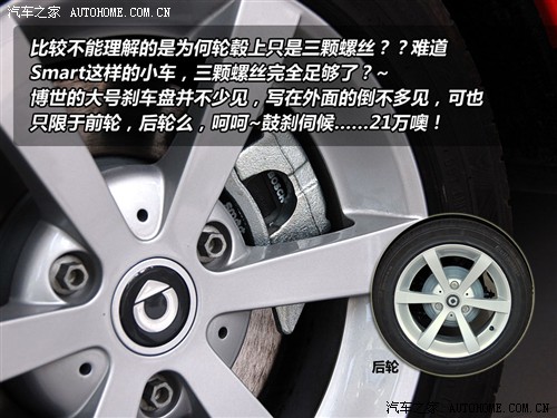 你注意到了嗎?smart的輪轂僅僅用三顆螺絲就固定在了軸承上,而一般我們見到的車至少需要4顆螺絲,看來這種車在國外真的是最低端的類型,但引進到國內,它的價格可不便宜,如果不是極端追求個性后者對smart情有獨鐘,還真不太好接受。