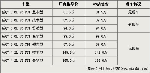 據(jù)北京奧迪4S店銷(xiāo)售人員介紹,新款的奧迪Q7有三個(gè)排量共7款車(chē)型,售價(jià)區(qū)間為81.5萬(wàn)元-165萬(wàn)元。目前店內(nèi)已經(jīng)到第一批先期預(yù)訂的奧迪新Q7現(xiàn)車(chē),車(chē)型為3.6L技術(shù)型和3.6L舒適型。現(xiàn)在欲購(gòu)買(mǎi)新Q7的消費(fèi)者需交1萬(wàn)元訂金,下個(gè)月中旬方可提車(chē)。