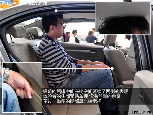 得益于較長的軸距,鋒范在內部縱向空間上的表現的確出色。但由于前排座椅設計的更為厚實一些,因此體驗者的腿部空間依然是和飛度上相同的兩拳。即便是換坐到中間座位,腿部依然有較出色的一拳多。此外鋒范的后排地板和飛度一樣屬于略有凸起但不影響舒適性的范疇。不過鋒范在內部垂直空間的表現上實難令人滿意,雖然車頂有為爭取更多頭部空間而設計的內凹造型,但實際效果不明顯。總之坐在鋒范內,體驗者的頭部壓抑和不適感十分明顯。