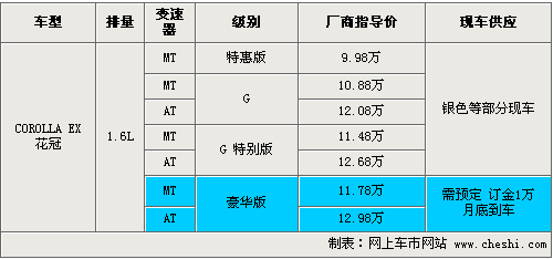 花冠EX系列兩款豪華版車型在增加了天窗的基礎上,還配置了真皮座椅、前閱讀燈等實用配置。價格放買你相比較G特別版漲了3000元。新增加的4款車型均為1.6小排量車型,消費者在購車同時可以享受購置稅優惠活動,目前尚沒有現車到店,消費者購車的話需要交訂金1萬元,預計月底可以到車。