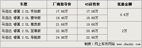 據一汽馬自達4S店銷售人員介紹,目前睿翼2.0L車型開始有小幅優惠,現金優惠6千元或購車送導航,而2.5L車型全系優惠達到了2萬元,現車顏色以黑色、銀色為主。另外2.5L尊貴版優惠后售價為19.68萬元,只和2.0L豪華版相差8千元,值得消費者考慮一下。睿翼部分顏色還需預訂,訂金只需500元,最快1周就可以提到車。如消費者有意購買,到店詳談會有更優惠的價格。北京地區各4S店由于訂單不同,各店銷售的現車顏色有所不同。