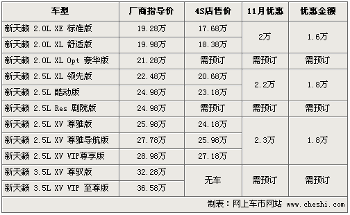 筆者了解,相比11月份的優(yōu)惠幅度,目前新天籟價(jià)格最高優(yōu)惠僅為1.8萬元,上個(gè)月的最高優(yōu)惠則為2.3萬元,但是現(xiàn)車供應(yīng)情況仍然比較緊張,除了標(biāo)準(zhǔn)版和舒適版有部分可選擇外,2.5升的部分車型仍需要訂購,月底將到一批新車。入門級(jí)優(yōu)惠后售價(jià)為17.68萬。