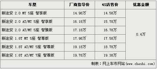 據北京上海大眾4S店銷售人員介紹,目前購買新途安的消費者可以得到4000元的現金優惠。全系價格最低的2.0MT 5座智享版車型經優惠后,售價從14.98萬元下降到了14.58萬元。銷售人員還介紹,目前新途安全系車型比較充足,消費者挑選的空間很大。
