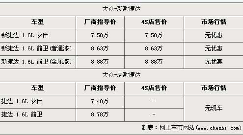據北京一汽大眾經銷店銷售人員介紹,大眾全新捷達1.6L分為伙伴版以及前衛版兩種車型,售價分別為7.58萬元和8.88萬元,由于前衛版白色車型采用的是普通漆油料,所以在廠商指導價方面會比前衛版其他顏色車型便宜2500元,售價為8.63萬元。銷售人員還介紹,老款的大眾捷達已經沒有現車,消費者已經無法購買到。