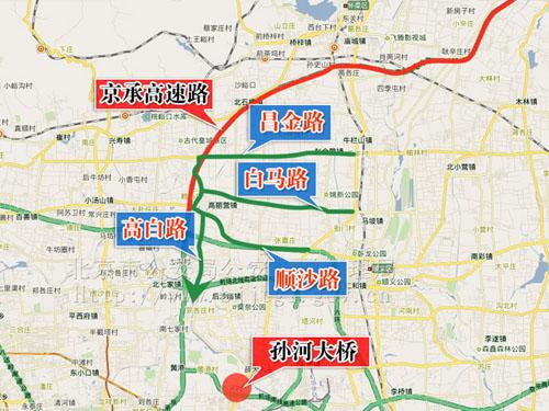 (四)由京密路方向進京的車輛,可分別由牛欄山路口繞行昌金路;由馬坡橋繞行白馬路;由西杜蘭路口繞行順沙路。