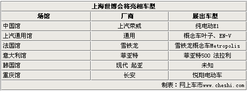 在本次世博會上,中國館中將展出上汽榮威推出的純電動車E1,這款車在本屆北京車展中已經(jīng)正式亮相,預(yù)計將在2012年正式實現(xiàn)量產(chǎn)。在通用館展出的EN-V日前已在上海以全球首發(fā)的身份亮相,由于造型不同他們分別被命名為“驕”、“妙”和“笑”。這款雙人座EN-V電動聯(lián)網(wǎng)車創(chuàng)新地融合了電氣化和車聯(lián)網(wǎng)兩大技術(shù),從而實現(xiàn)未來城市交通零油耗、零排放、零堵塞和零事故。其余將亮相的車型還包括雪鐵龍全新概念車Metropolis、菲亞特500、法拉利和長安悅翔電動車等。