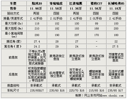 首先,作為一款SUV,人們除了關注他們的基本信息外,更看重的就是它實際的通過性和操控性。通過上表我們可以看到,除了獵豹CS7,其他4款車型的離地間隙都處于一個比較優秀的水平上,這為人們日常出行郊游,順利通過略微惡略的路況提供了保障。另外,值得一提的就是5款SUV的底盤結構,瑞虎、瑞鷹和CS7三款都采用了中規中矩的承載式設計,而陸風X8和哈弗H5則采用了純正的越野車底盤設計-非承載式,讓車輛在越野路況也可以更順暢的通過。