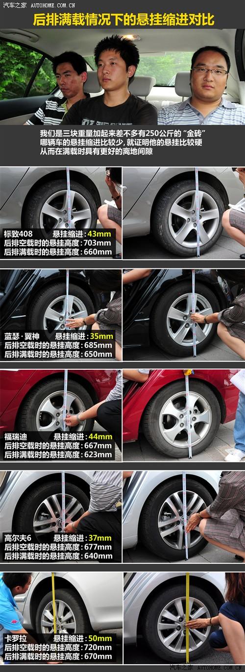 為什么進行懸掛縮進的對比呢?因為緊湊型車大部分都是作為家庭用車,而且因為我們的車輛保有率還不是很高,所以經常一車多用,后排坐滿乘員的情況并不稀奇,甚至當做貨車使用也不是沒有可能,而太軟的懸掛在面對這種大強度的承載時就會出現“塌屁股”的現象,這也就是為什么捷達、邁騰、天籟等車型出現塌屁股的重要原因。
