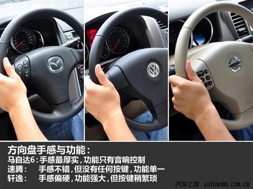 對(duì)比配置,我們先從安全性配置開始,在這方面,無(wú)疑速騰是最大的贏家,因?yàn)轳R自達(dá)6除了最基本的ABS+EBD和雙氣囊之外,沒(méi)有別的更多安全配置;而速騰是全系標(biāo)配ESP和側(cè)氣囊的;軒逸盡管主動(dòng)安全配置沒(méi)什么亮點(diǎn),但這款高配車型有側(cè)氣囊,而且可以選裝頭部氣簾,所以還是比馬自達(dá)6更勝一籌。