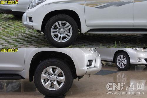 功能配置差異:此外,國產車型增添配置了電動調節座椅,電動調節方向柱,座椅加熱功能,智能感應鑰匙一鍵啟動系統,電動天窗等等。普通車型音響系統采用6碟CD和9個揚聲器,而兩款NAVI車型則采用了更高的6碟DVD和14揚聲器配置。不同于進口車型的265/65R17輪胎,國產高配VX車型配置更加美觀的18寸五輻條雙叉臂鋁合金輪轂和265/60R18鄧祿普GTANDTREK系列AT22輪胎。
