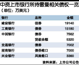 此前已經公布的有:工行持有美國雷曼兄弟公司債券及與雷曼信用相掛鉤債券余額共1.518億美元;中行對雷曼的總風險敞口達1.2882億美元;興業銀行與美國雷曼兄弟相關的投資與交易產生的風險敞口總計折合3360萬美元;招行持有雷曼兄弟債券共計7000萬債券;交通銀行持有雷曼兄弟控股公司及其子公司發行的債券7002萬美元,上述債券僅占交行截至2008年6月30日總資產的0.02%,凈資產的0.35%。此外,深發展、寧波銀行已經明確表示,未持有美國次級債券,也未持有雷曼兄弟公司和美國其他金融機構發行的任何債券,沒有與雷曼兄弟公司發生業務交易。(記者 張歆)