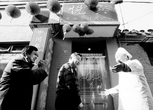 昨日下午,記者來到翠花胡同內的悅賓飯店門口,正碰見76歲高齡的郭培基老漢穿著白色的廚子衣服,頭戴高高的廚子帽,吆喝著迎接每一位顧客。郭培基說,過年了,自己“很興奮”,“闊別十來年的廚子帽今天特意戴上,就為迎接2008年的春節。”走進店內,郭培基看著擠滿了座位的食客們,高興得合不攏嘴。“百分之九十以上都是我多年的老主顧。”話音未落,一桌顧客大聲求郭老先生白送兩道拿手菜,老郭一口應允。一位姓張的顧客說,他到老郭店里吃飯已有十余年了,“老郭手藝很好,店里的飯菜也很便宜。我們要求賞道菜,老郭從不含糊!”