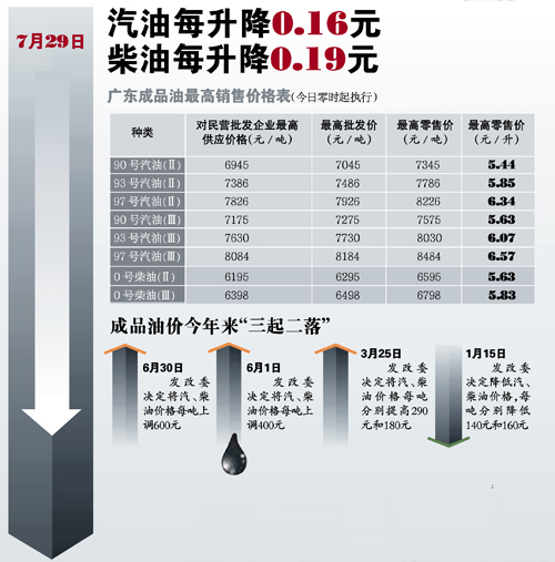隨后,省物價局根據國家規定,也制定公布了廣東省的成品油銷售價格。這也是全省成品油價格繼6月份一個月內連續2次上漲之后,首次出現下調。降價的幅度從0.16元/升~0.20元/升不等,其中國Ⅲ標準97號汽油降價最多,降價后每升最高零售價為6.57元。