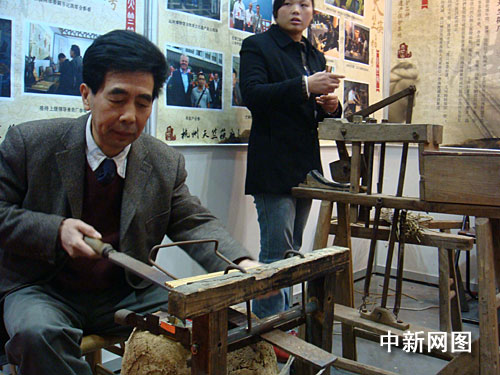 杭州一家主營筷子的企業正在現場展示傳統制筷工藝。姜越潮 攝