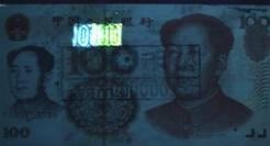 假鈔用紙均為一般社會化用紙,不含棉纖維,光滑、綿軟、無韌性、偏厚,抖動或用手彈時聲音發悶。在紫外光下一般有熒光反應(見下圖)。