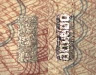 第四種偽造安全線是第二種和第三種的組合,既有燙印開窗,又有實物安全線置于紙張夾層內。(見下圖)