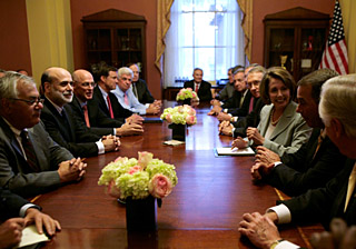 在公布金融救援計劃前,美國財政部長保爾森、美國聯(lián)邦儲備委員會主席伯南克和布什進行了緊急磋商;保爾森等官員隨后又拜會多位資深議員,爭取到了他們的支持。