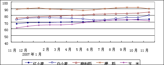 糧食收購價(jià)格總體略有上漲。11月份,全國25個(gè)糧食主產(chǎn)省(區(qū)、市)國有、非國有糧食企業(yè)(下同)稻谷、小麥、玉米三種糧食加權(quán)平均收購價(jià)格為每50公斤(下同)79.96元,比上月略漲0.38%,比上年同期上漲11.92%。其中,小麥平均收購價(jià)為78.51元,比上月上漲3.10%,比上年同期上漲9.60%。稻谷平均收購價(jià)為85.59元,與上月基本持平,比上年同期上漲8.63%。玉米平均收購價(jià)為71.76元,比上月下降1.73%,比上年同期上漲22.33%。