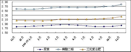 化肥價(jià)格小幅上漲。11月份,國產(chǎn)尿素、磷酸二銨、三元復(fù)合肥全國平均零售價(jià)格分別為1. 83元/公斤、2.79元/公斤、2.24元/公斤,比上月分別上漲2.23%、2.95%、3.23%。