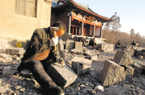 進入山門內(nèi),一座壯觀的金頂大雄寶殿坐北朝南,院內(nèi)一片繁忙景象,50多位石匠正在用老式的打石方式,一塊一塊擊打著青石,切好的石塊被抬到大雄寶殿一東一西在建的兩座建筑上。