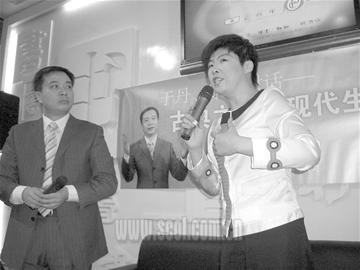 于丹是當天亮相圖書訂貨會的唯一 “腕級人物”,看得出她此次精心打扮了一番,一頭短發梳得服服帖帖,臉上化的妝比往常來得更濃烈,身上穿一件貼身白襯衣,襯衣領口鑲黑邊,對襟和袖口鑲紅邊,款式頗為奇特。于丹現在紅得發紫,因此一些觀眾帶著“獵奇”的想法來看她,他們當中的不少人都表示,看到真人后發現有些失望。有女觀眾建議她應該去買些好點的化妝品保養皮膚,還有人說她穿的衣服太 “另類”,沒顯出“范兒”。可于丹不顧大伙對自己的評頭論足,仍在臺上口若懸河。(記者 楊帆攝影報道)