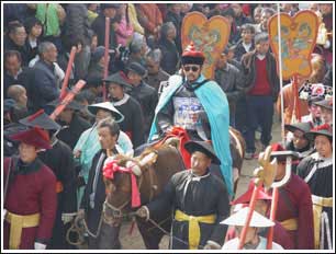 為了迎接身穿清朝官服、嘴角邊耷拉著兩撇長胡須、帶著圓餅狀墨鏡的主角——“牛老爺”,村民們?cè)缭缇兔钇饋怼_@次耍社火,主角“牛老爺”可是從全村人中按照德貌雙全的標(biāo)準(zhǔn)篩選出來的。“牛老爺”穿靴戴帽掛官服,裝扮成清朝官員,還騎頭大黃牛,煞是威風(fēng)。