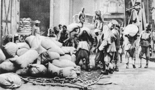 華工和英國部隊在法國的一處停車場裝卸糧食