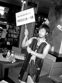 座談會(huì)進(jìn)行了一個(gè)小時(shí)左右,還算順利,但接下來的簽售環(huán)節(jié)卻出現(xiàn)了一個(gè)小插曲,“大概簽了有十多分鐘時(shí),我聽到場(chǎng)上有人在笑,原來是有人在我身后舉著‘反對(duì)炒作!!開除無良文人張一一省籍’的牌子以示抗議,但這并未影響我的心情。”張一一說。