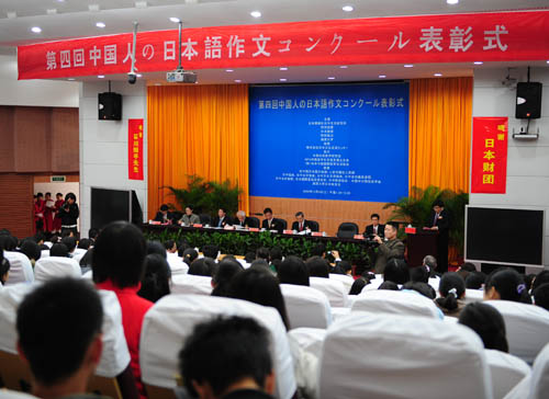 日本駐華大使館特命全權(quán)大使宮本雄二為頒獎(jiǎng)典禮發(fā)來(lái)了中日雙語(yǔ)版賀詞,高度評(píng)價(jià)日中交流研究所主辦的中國(guó)人日語(yǔ)征文大賽,為促進(jìn)日中兩國(guó)人民的相互理解起了積極的作用。