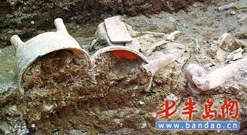 雖然這次沒有在墓葬中發(fā)現(xiàn)青銅鼎,但發(fā)現(xiàn)了簋、鬲、豆、罐等陶器,而且還發(fā)現(xiàn)了殉狗的骨骼及牛的部分骨骼。山東大學(xué)的王芬老師告訴記者,殉葬狗是當(dāng)時的一種社會風(fēng)俗。雖然當(dāng)時處于奴隸制社會,但隨著文明的進步,已經(jīng)用殉狗來代替殉人。此外,還發(fā)現(xiàn)了周代人用來存儲糧食的窖藏遺址和丟放垃圾的灰坑。根據(jù)此次的發(fā)掘結(jié)果,青島市文物保護考古研究所所長林玉海認(rèn)為這是一個周代貴族的墓地。