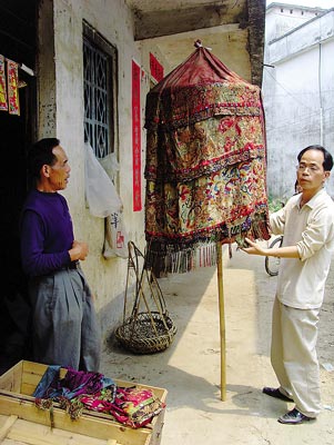 采訪中,李初愛老伯常提起祖先留傳下來的官傘,原來,這傘是冷坑李氏一族的“傳家寶”。李初愛小心翼翼地從房間里的一口木箱中取出折疊好的兩頂官傘,記者見到,木箱底中墊放有鞭炮。“這可以驅(qū)蟲防潮,”李初愛解釋說,“村中遇有大喜事,才啟用這兩頂官傘。”