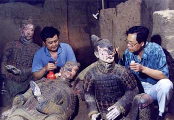 多年來,彩繪的保護成為秦俑文物保護工作中一項迫切的重大難題。為保護彩繪,秦始皇兵馬俑博物館成立了彩繪保護科技課題組,并于上世紀90年代初與德國巴伐利亞州文物保護局開展合作,全面、系統地揭示了彩繪的層次結構、物質組成、彩繪工藝以及損壞機理。