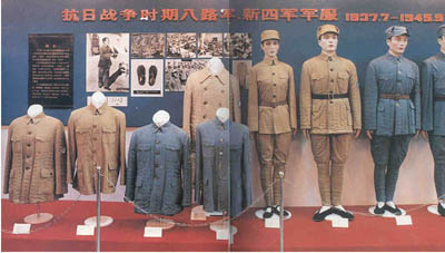 抗戰爆發后,紅軍改編為八路軍、新四軍,服裝、標志基本與國民黨軍隊相同。八路軍、新四軍都佩戴“青天白日”帽徽,但臂章上卻清楚地標明了自己的身份。八路軍佩戴“八路”長方形臂章,新四軍佩戴“新四軍”或“N4A”的臂章。八路軍的軍服顏色多為土黃色,新四軍多為灰色。