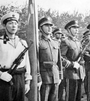 1984年國(guó)慶35周年閱兵,受閱陸海空三軍部隊(duì)全部換上85式新軍服:陸軍方隊(duì)的軍官全部著棕綠色毛料軍服,海軍方隊(duì)軍官著上身白色下身藏藍(lán)色軍服,空軍方隊(duì)軍官著上身棕綠色下身深藍(lán)色軍服。
