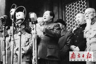 隨后,毛澤東等領導人乘車出中南海東門,從故宮西華門南拐至闕右門,再往南直達天安門,登上了城樓的一百級臺階……