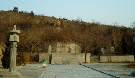 1 月6日,正值今冬最凜冽的天氣,村子里行人稀少,墓園里一片靜寂,兩扇朱紅色大門上面書有“曹植墓”三字,寒風蕭瑟中,倍顯莊嚴肅穆。從側門進入墓園中,一座低矮的山丘佇立,山上挺立的青松之間,各種叢木枝節盤繞,迎面便是青色古磚砌成的曹植墓。為防止雨水侵蝕,墓門現已經封閉,無法進入甬道和墓室。
