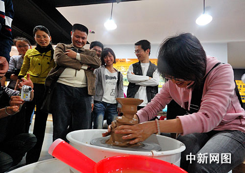 制作現場上,優美動聽的古箏樂曲不停地繚繞盈耳,瓷藝家們或捏或雕,或刻或鏤,或推或接,各種傳統技法紛紛上陣,精彩紛呈。這行云流水般的手法、精妙細致的做工、別出心裁的設計,讓參觀者看得眼花繚亂,贊嘆不已,為之折服。人們忍不住上前摸一摸細膩的瓷泥,轉一轉工作盤,拿一拿精致的制作工具。前來參觀的顏小姐不禁挽起袖子也親身體驗了一回手拉坯。在轉盤的帶動下,顏小姐雙手輕拉瓷泥,那團柔軟的瓷泥仿佛有了靈性一般“舞蹈”起來,一會變成一個款嘴的大海碗,一會又變成一個細腰的小花瓶。舉著滿手的瓷泥,顏小姐開心地說:“太有意思了,讓我想起小時候玩泥巴的情景。”她還表示:“下次有空的時候,我一定還要再來玩手拉坯,DIY一件作品做紀念。”