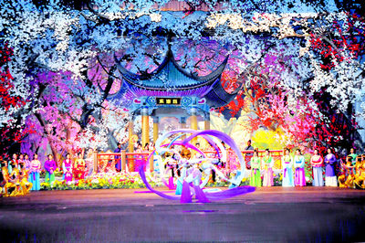 朝鮮版歌舞劇《紅樓夢》第四幕中的《花滿大觀園》場景。資料圖片
