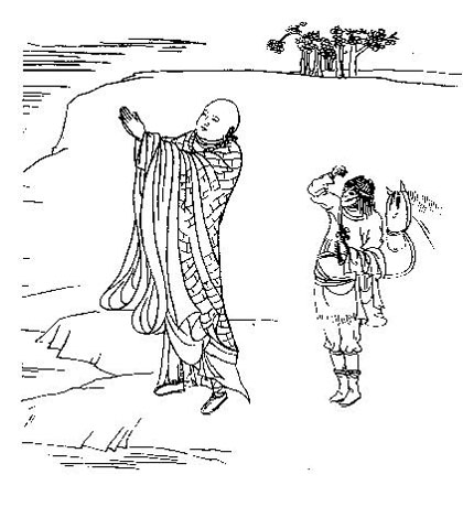 在榆林窟第2窟、第3窟、第29窟及東千佛洞第2窟內(nèi),都繪制了這樣一幅壁畫:一名出家人面對(duì)洶涌的河水雙手合十,身后長(zhǎng)著猴相的弟子牽著一匹馱經(jīng)老馬,遠(yuǎn)處有一片樹林。
