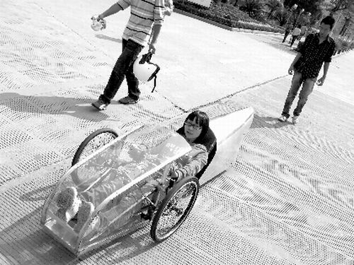 經(jīng)2個(gè)月的定型,2個(gè)月的組裝后,一個(gè)漂亮的成品汽車終于亮相了。這輛耗資2萬(wàn)元,時(shí)速達(dá)100公里的小汽車車身設(shè)計(jì)呈流線型,車手只能伸直腿半臥在駕駛室里,比F1賽車的車倉(cāng)還小。制造好汽車后,開(kāi)始在全校選拔符合駕駛要求的車手,由于汽車屬機(jī)動(dòng)車,必須持有C照以上的駕照,同時(shí)還要對(duì)車的性能很了解,而個(gè)子也需要矮小才行。最終身材嬌小的女生周卓同學(xué)脫穎而出成為了賽車手。