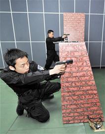 射擊訓練中心的實戰模擬射擊室更有現場感。屏幕上,兩名持槍劫匪突然出現在某銀行營業部,接到報警后,警察將現場包圍,對峙談判無果后,歹徒舉槍射擊,面向屏幕的教官涂明焰和王強同時開槍,兩名歹徒應聲倒地,任務成功!“這是無線電波覆蓋區,訓練者的任何動作都反映在屏幕內。”涂明焰介紹。據了解,控制中心有上千個不同犯罪模擬場景,同一現場中,歹徒可能持刀,可能持槍,也可能投降,現場民警必須根據具體情況,選擇是喊話勸降,是使用胡椒噴霧器、警棍,還是開槍射擊。