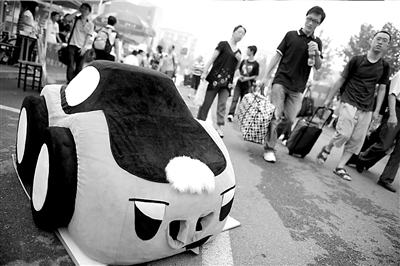 迎新現(xiàn)場(chǎng),新生的班車一到,師哥師姐們便追車“搶人”。大鼓助興、統(tǒng)一著裝,大家各盡其能。汽車系的攤位前還擺上了一輛巨大的毛絨玩具汽車,格外醒目。