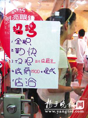 “招聘:全職,勤快,僅限211應(yīng)屆生,底薪1500+提成,店洽”。這家名為“彩虹糖”的外貿(mào)服飾店門口貼出的招聘啟事20字左右卻沖擊力十足,其中“僅限211應(yīng)屆生”部分還用紅色筆著重標出。