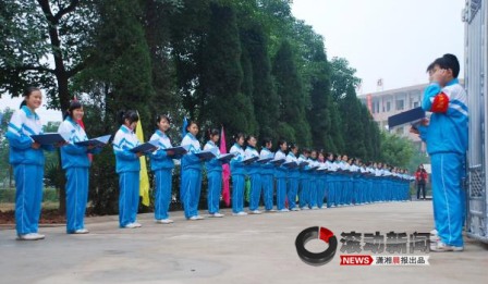 照片顯示,蓬安縣河舒初中數(shù)百名學(xué)生身著校服,整齊地列兩隊(duì)站在學(xué)校道旁,每人拿著一本書做朗讀狀。他們迎來(lái)的是蓬安縣教育局黨委書記、局長(zhǎng)姚勇和其他領(lǐng)導(dǎo)。懸掛在校門口的橫幅上寫著:“蓬安縣學(xué)校常規(guī)管理現(xiàn)場(chǎng)會(huì)河舒初中現(xiàn)場(chǎng)”,學(xué)校教學(xué)樓還掛了橫豎三幅巨大的歡迎標(biāo)語(yǔ)。