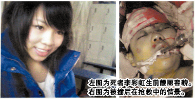 去年12月26日凌晨,湖南打工妹李彩虹離開工作的酒店返回宿舍,誰料走到花都區新華街與商業大道的交叉口時,一輛紅色寶馬Mini小轎車飛馳而過,將她撞死。駕車人是廣東外語外貿大學大三學生任偉煒。兩人是同齡人,當時都只有21歲。肇事者任偉煒當即駕車逃逸,至今未歸案。