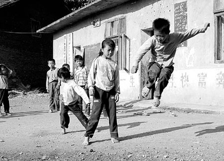 自從去年雨季,操場(chǎng)上的木頭籃球架被水泡壞后,孩子們就只剩下一個(gè)破足球可以踢踢了。最受歡迎的還是活動(dòng)課。20個(gè)孩子圍成兩個(gè)圈玩兒追逃游戲,又緊張又興奮,尖叫著追逐,笑倒在地上。